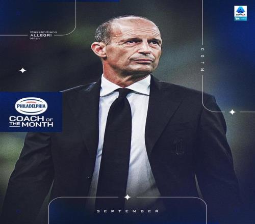 雷速体育10月10日报道宣称 根据意甲联赛官方的消息,AC米兰主教练阿莱格里当选为了意甲9月最佳主帅。