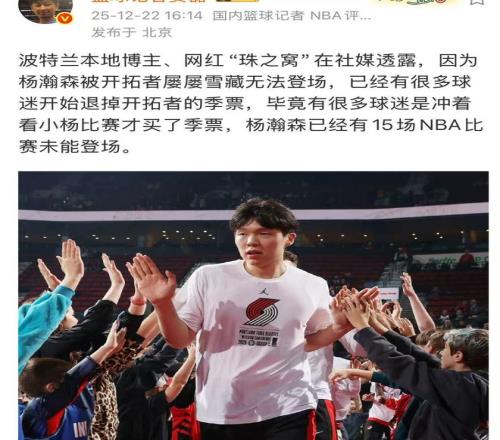 各位球迷都知道,目前NBA常规赛正在进行中,而杨瀚森多次跟随球队,却接连被教练组弃用,甚至连一分钟的登场时间都不给咱们的小杨,这样的做法自然也是惹怒了很多中国的球迷。除了在网络上提起批评之外,另外一方面,当地很多的华人球迷,甚至连美国球迷都开始反击开拓者,纷纷想要退掉赛季的门票,要求球队必须给出一个说法,这对于杨瀚森来说也许是一个好事。