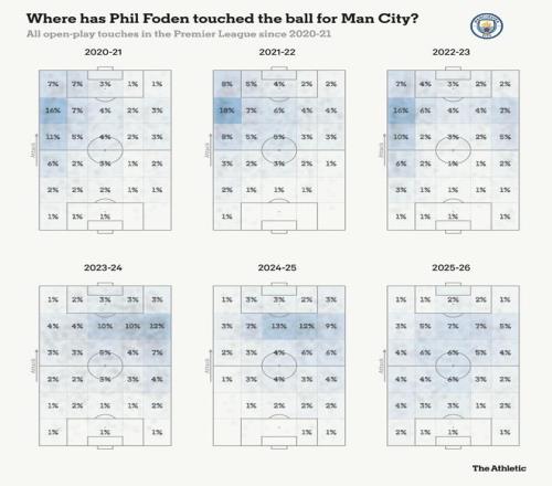 英格兰队主教练托马斯-图赫尔已确信他属于中路,在那里,他对比赛的影响力比以往任何时候都大。罗德里本赛季长期缺阵可能是一个因素,但如下图所示,福登回撤接应、帮助曼城破解对手高位逼抢的次数也达到了前所未有的程度。
