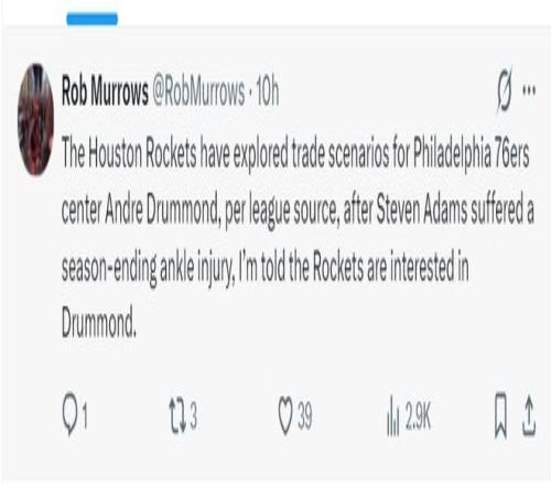 赛后根据美记Rob Murrows的报道,联盟有消息人士透露,因为亚当斯左脚踝手术赛季报销,火箭队已经开始探索交易安德烈-德拉蒙德,休斯顿对庄神非常感兴趣。