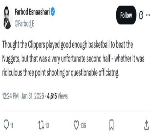 正如赛后快船记者Farbod Esnaashari所说:“尽管快船本场比赛的表现足以击败掘金,但下半场的状况的确艰难,不仅要面对离谱的三分投射效率,还要应对颇具争议的吹罚尺度。”