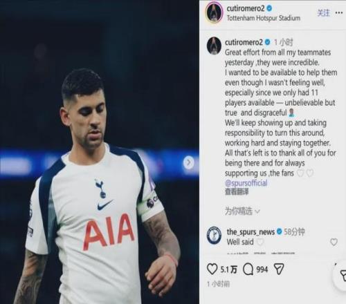 北京时间2月3日,在热刺2-2艰难战平曼城之后,队长罗梅罗更新社交媒体。这位阿根廷中卫不仅解释了自己因何被换下场,同时也对热刺管理层在冬窗转会市场上引援不力进行了挖苦。白百合军团在多达9名一线队球员缺阵的情况下,从两球落后的劣势中扳平比分,拿到了提升英超排名路上的关键一分。