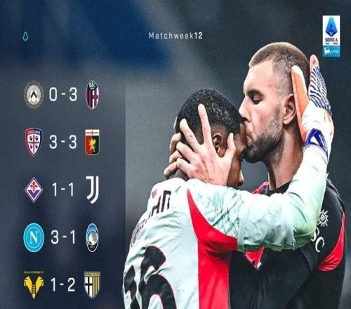 北京时间11月23日凌晨,2025-26赛季意甲联赛第12轮开踢,昨夜今晨进行了4场比赛的争夺。经过一番鏖战,尤文客场1:1战平佛罗伦萨,那不勒斯主场3:1轻取亚特兰大,博洛尼亚客场3:0大胜乌迪