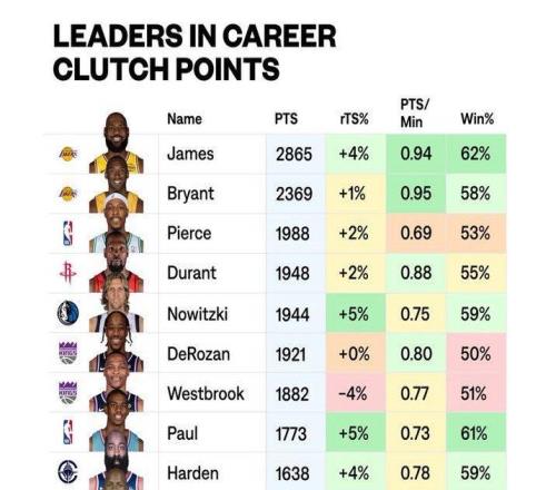 2月1日。有媒体统计并公布了一个数据,那就是关键时刻的总得分和胜率。关键时刻就是最后五分钟内双方比分差距在5分以内,这种时刻比末节和加时赛更能体现一个球员的心理素质和