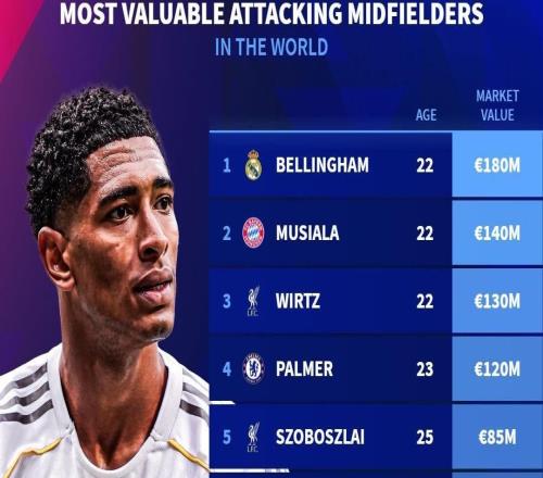 在完成最新一次身价更新后,德国转会市场网站列出了进攻型中场身价榜,贝林厄姆以1.8亿欧居首,穆西亚拉以1.4亿欧位列第二,维尔茨以1.3亿欧排名第三。德转列世界足坛进攻型中场身